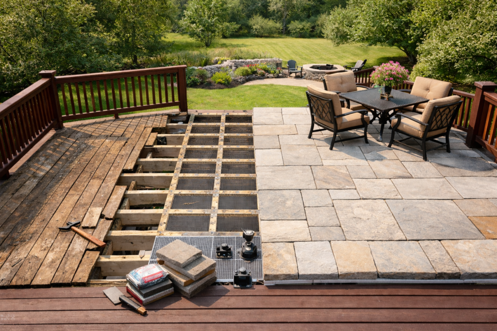 If the structural frame of the deck remains in good condition, tearing down the entire structure is not always necessary. Instead of rebuilding the same type of deck again, homeowners have the opportunity to upgrade the surface completely. This is where the StoneDeks system offers a different path forward, allowing real stone, porcelain, or pavers to be installed over standard deck framing without requiring a full demolition.