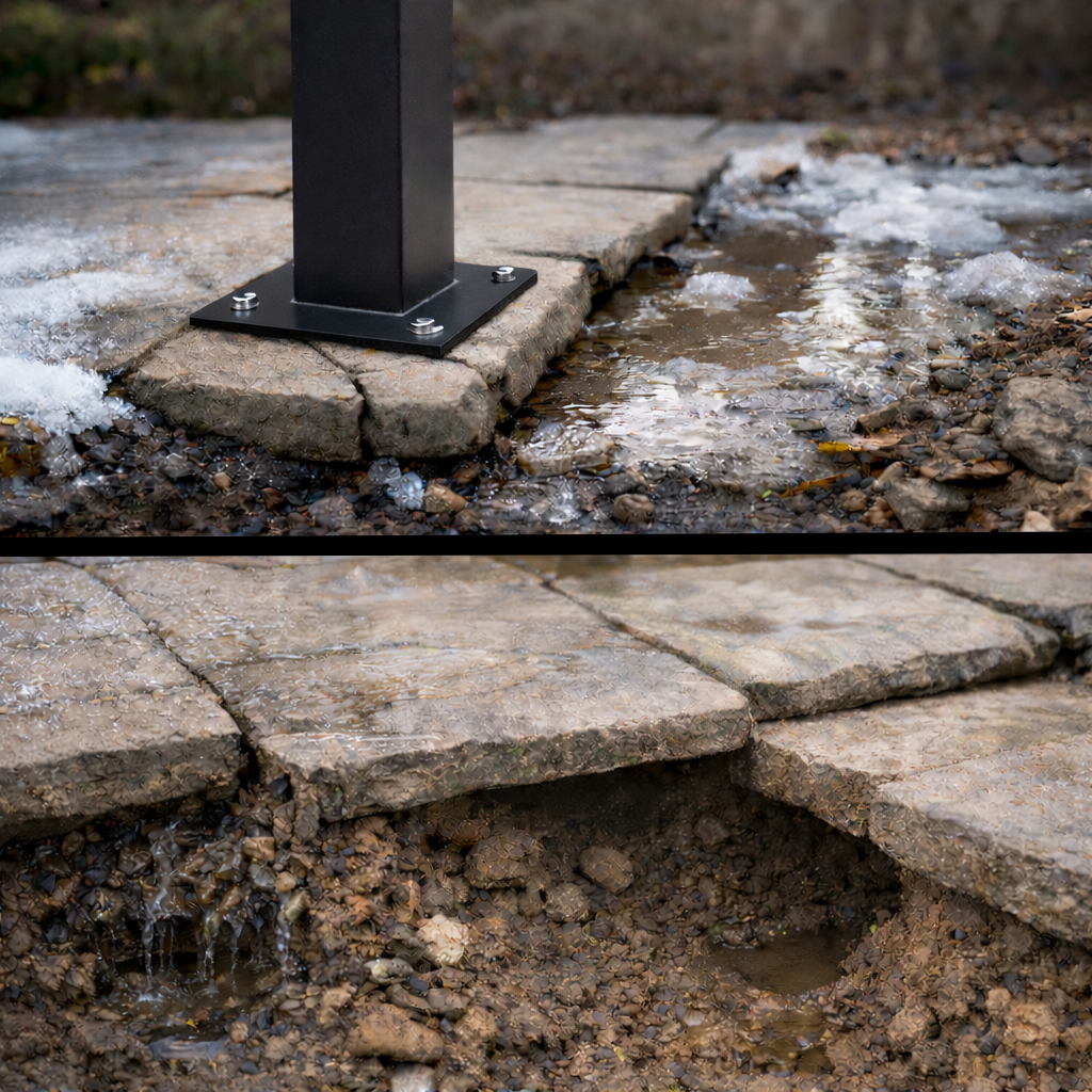If you have seen patios become uneven, edges separate, or walkways sink after a few seasons, you have seen soil movement at work. What looks like a surface issue is almost always a foundation issue. Before we talk about solutions, we need to talk about what is actually happening below the surface.
