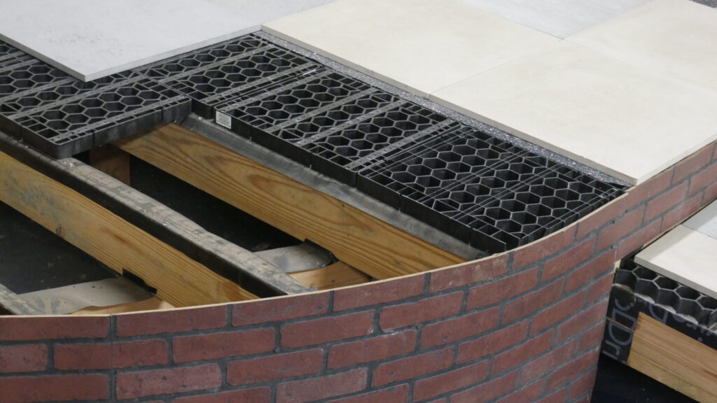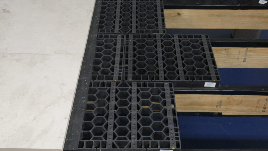 This system creates a layer that separates the deck structure from the finished surface. That separation allows water to drain properly and allows materials to move without stressing the framing or the stone itself. The system effectively bridges the gap between framed construction and a masonry style finish.
